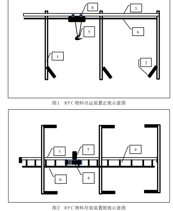 物料吊運裝置設計結構示意圖,如圖 1 和圖 2所示。圖中:1—基礎支架;2—支架斜支撐;3—運行軌道;4—電動葫蘆;5—物料吊鉤;6—電路滑線;7—移動電機;8—移動滾輪;9—滑線支架。